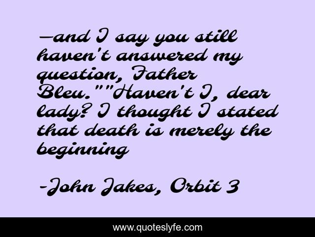 This page presents the quote "—and I say you still haven't answered my question, Father Bleu.""Haven't I, dear lady? I thought I stated that death is merely the beginning". Author of this quote is John Jakes, Orbit 3. This quote is about here-is-thy-sting, 1968, death, fear-of-death, mysticism,.