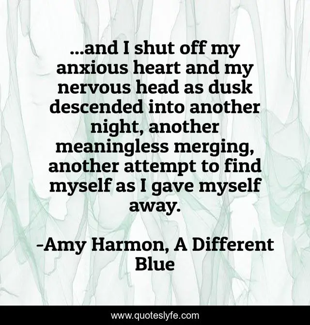 This page presents the quote "...and I shut off my anxious heart and my nervous head as dusk descended into another night, another meaningless merging, another attempt to find myself as I gave myself away.". Author of this quote is Amy Harmon, A Different Blue. This quote is about anxious, heart, night,.