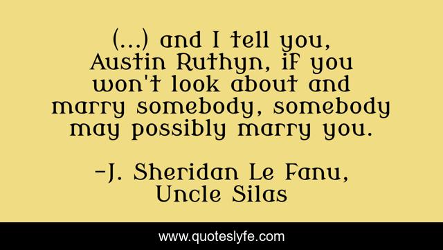 This page presents the quote "(...) and I tell you, Austin Ruthyn, if you won't look about and marry somebody, somebody may possibly marry you.". Author of this quote is J. Sheridan Le Fanu, Uncle Silas. .