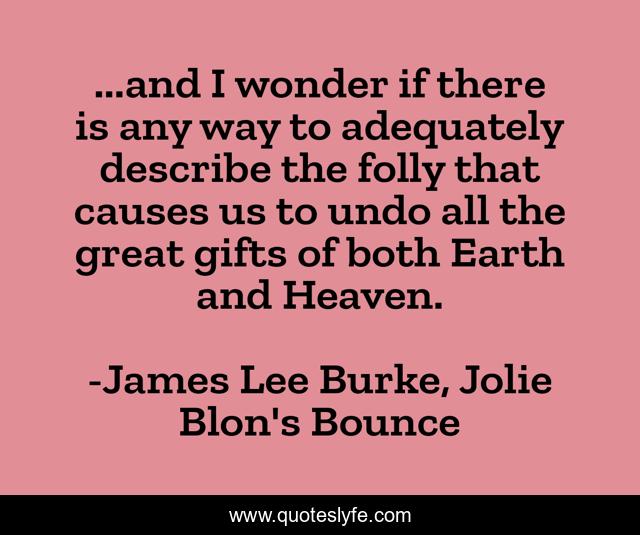 This page presents the quote "...and I wonder if there is any way to adequately describe the folly that causes us to undo all the great gifts of both Earth and Heaven.". Author of this quote is James Lee Burke, Jolie Blon's Bounce. This quote is about gifts, earth, folly, heaven, mistakes-man-makes,.