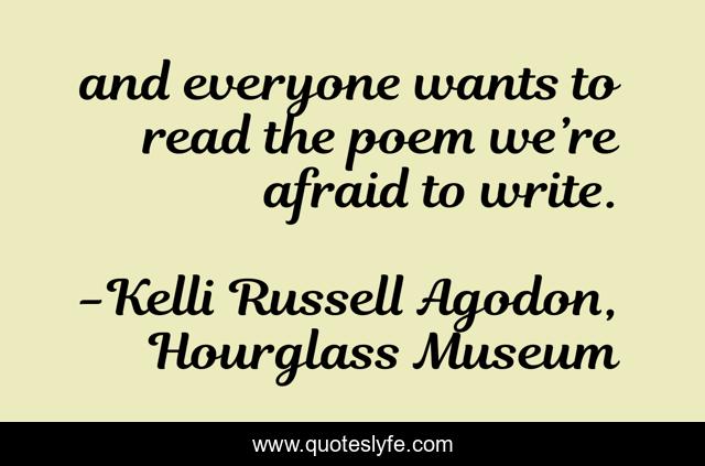 This page presents the quote "and everyone wants to read the poem we’re afraid to write.". Author of this quote is Kelli Russell Agodon, Hourglass Museum. This quote is about poets, vulnerability, poetry, writers, poems, fear, inspiration,.