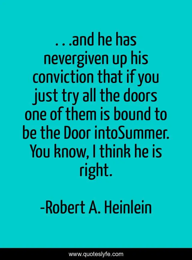 This page presents the quote ". . .and he has nevergiven up his conviction that if you just try all the doors one of them is bound to be the Door intoSummer. You know, I think he is right.". Author of this quote is Robert A. Heinlein. This quote is about summer, door,.