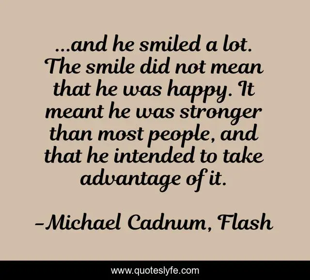 This page presents the quote "...and he smiled a lot. The smile did not mean that he was happy. It meant he was stronger than most people, and that he intended to take advantage of it.". Author of this quote is Michael Cadnum, Flash. This quote is about flash, michael-cadnum, smile, strong, happiness, happy,.