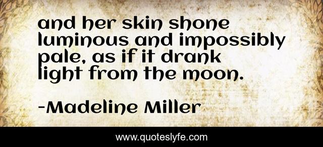 This page presents the quote "and her skin shone luminous and impossibly pale, as if it drank light from the moon.". Author of this quote is Madeline Miller. This quote is about apt-phrasing, similes, beauty,.