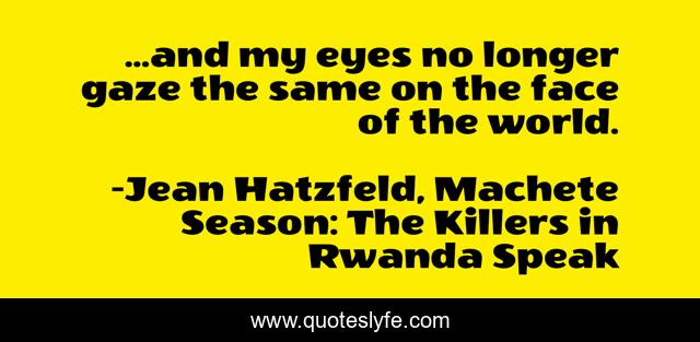 This page presents the quote "...and my eyes no longer gaze the same on the face of the world.". Author of this quote is Jean Hatzfeld, Machete Season: The Killers in Rwanda Speak. This quote is about world, eyes, perception, rwandan-genocide,.
