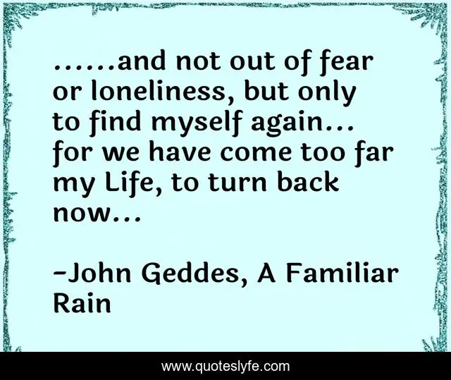 This page presents the quote "......and not out of fear or loneliness, but only to find myself again... for we have come too far my Life, to turn back now...". Author of this quote is John Geddes, A Familiar Rain. This quote is about find-myself, fear, loneliness, turn-back, poetry,.