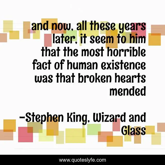 This page presents the quote "and now, all these years later, it seem to him that the most horrible fact of human existence was that broken hearts mended". Author of this quote is Stephen King, Wizard and Glass. This quote is about love, humanity, affection,.