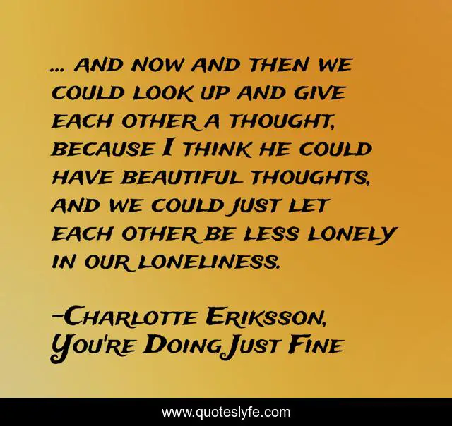 This page presents the quote "… and now and then we could look up and give each other a thought, because I think he could have beautiful thoughts, and we could just let each other be less lonely in our loneliness.". Author of this quote is Charlotte Eriksson, You're Doing Just Fine. This quote is about beautiful, lonely, look, look-up, poetry, less-lonely, nostalgic, alone, loneliness,.