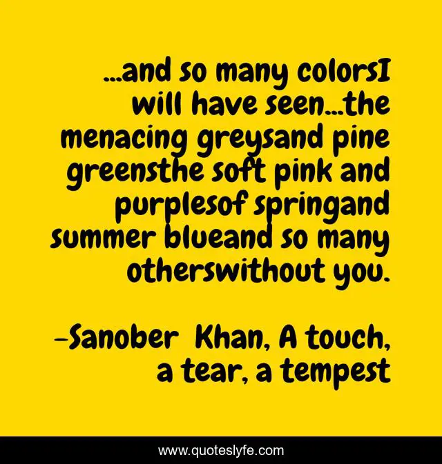 "Sanober Khan, A touch, a tear, a tempest Quotes." Quoteslyfe.com, 2025. Fri. 05 Dec. 2025. <https://www.quoteslyfe.com/quote/and-so-many-colorsI-will-have-seen-182239>.