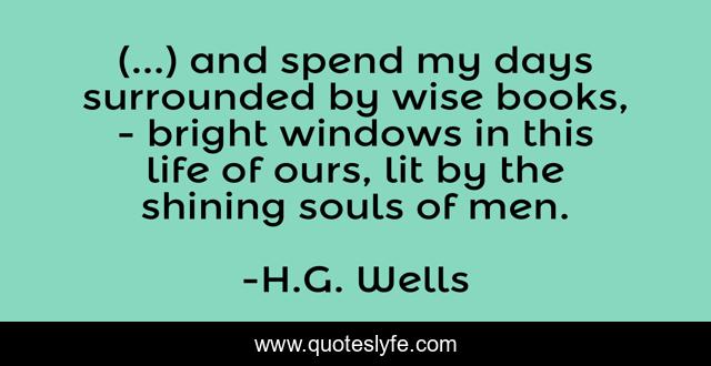 This page presents the quote "(...) and spend my days surrounded by wise books, - bright windows in this life of ours, lit by the shining souls of men.". Author of this quote is H.G. Wells. This quote is about enthusiasm, books, inspirational,.
