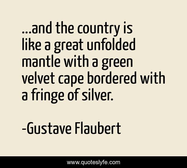 This page presents the quote "...and the country is like a great unfolded mantle with a green velvet cape bordered with a fringe of silver.". Author of this quote is Gustave Flaubert. This quote is about imagery, nature,.