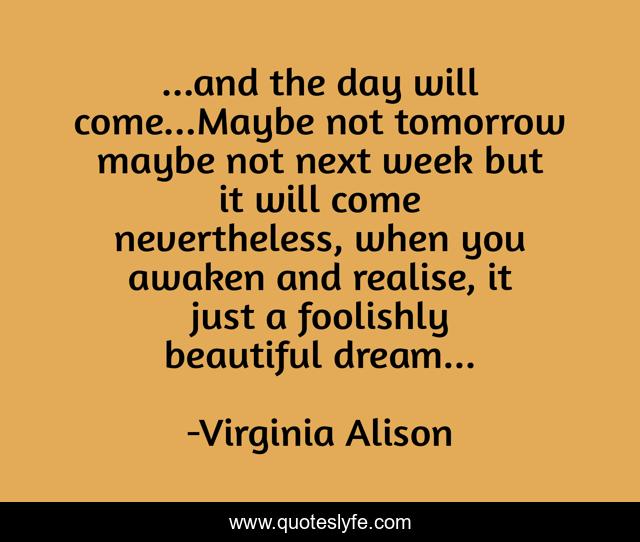 This page presents the quote "...and the day will come...Maybe not tomorrow maybe not next week but it will come nevertheless, when you awaken and realise, it just a foolishly beautiful dream...". Author of this quote is Virginia Alison. This quote is about dream, foolish, love, tomorrow, affection,.