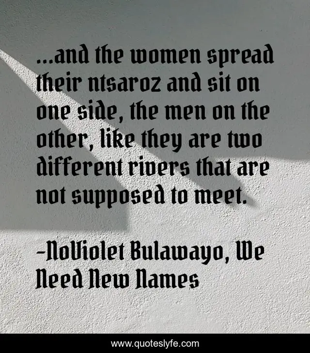 This page presents the quote "...and the women spread their ntsaroz and sit on one side, the men on the other, like they are two different rivers that are not supposed to meet.". Author of this quote is NoViolet Bulawayo, We Need New Names. This quote is about gender, poetic,.