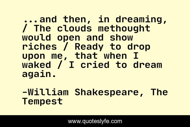 This page presents the quote "...and then, in dreaming, / The clouds methought would open and show riches / Ready to drop upon me, that when I waked / I cried to dream again.". Author of this quote is William Shakespeare, The Tempest. This quote is about beauty, dreams, nature,.