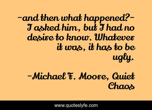 This page presents the quote "-and then what happened?- I asked him, but I had no desire to know. Whatever it was, it has to be ugly.". Author of this quote is Michael F. Moore, Quiet Chaos. This quote is about ugly, chaos, quite,.