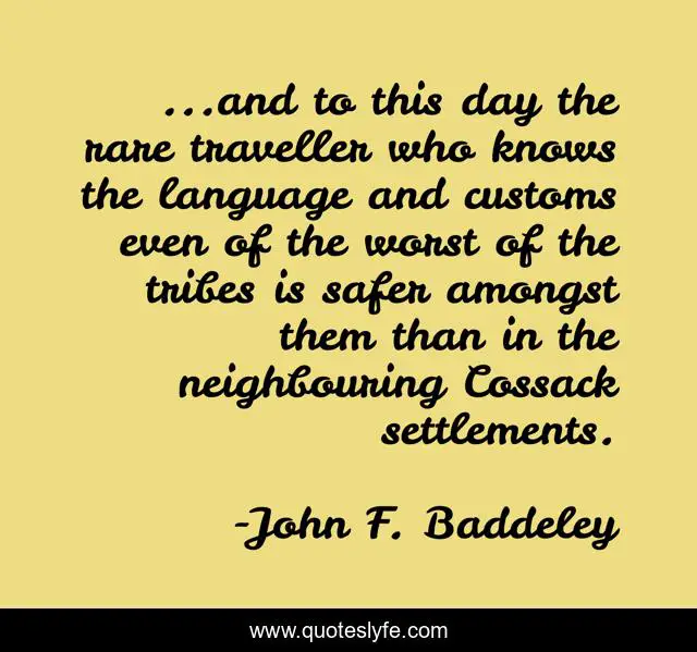 This page presents the quote "...and to this day the rare traveller who knows the language and customs even of the worst of the tribes is safer amongst them than in the neighbouring Cossack settlements.". Author of this quote is John F. Baddeley. This quote is about caucasus, conquest, war, russia, conflict, history,.