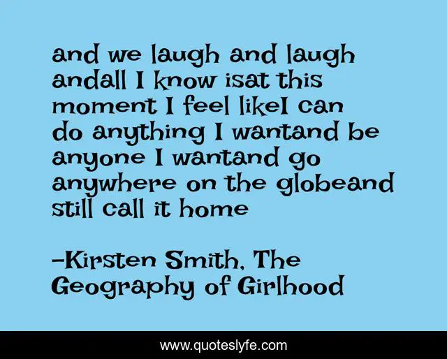 This page presents the quote "and we laugh and laugh andall I know isat this moment I feel likeI can do anything I wantand be anyone I wantand go anywhere on the globeand still call it home". Author of this quote is Kirsten Smith, The Geography of Girlhood. This quote is about bliss, laughter, happiness, wanderlust,.
