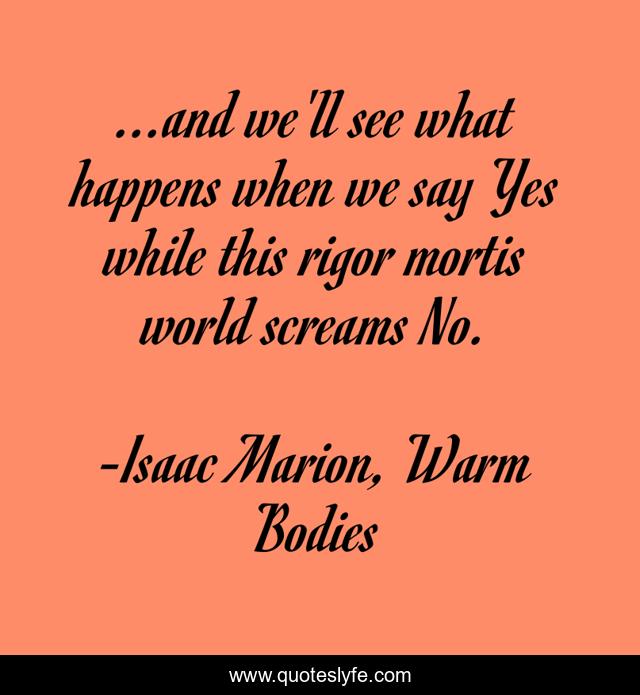 This page presents the quote "...and we'll see what happens when we say Yes while this rigor mortis world screams No.". Author of this quote is Isaac Marion, Warm Bodies. This quote is about zombies, hopeful, rebellious, rebellion, inspirational, enthusiasm, anti-mainstream, hope,.