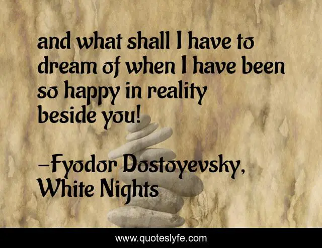 This page presents the quote "and what shall I have to dream of when I have been so happy in reality beside you!". Author of this quote is Fyodor Dostoyevsky, White Nights. This quote is about dream, love, happiness, affection,.