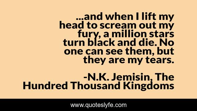 This page presents the quote "...and when I lift my head to scream out my fury, a million stars turn black and die. No one can see them, but they are my tears.". Author of this quote is N.K. Jemisin, The Hundred Thousand Kingdoms. This quote is about fury, loss, sorrow, pain, tears,.