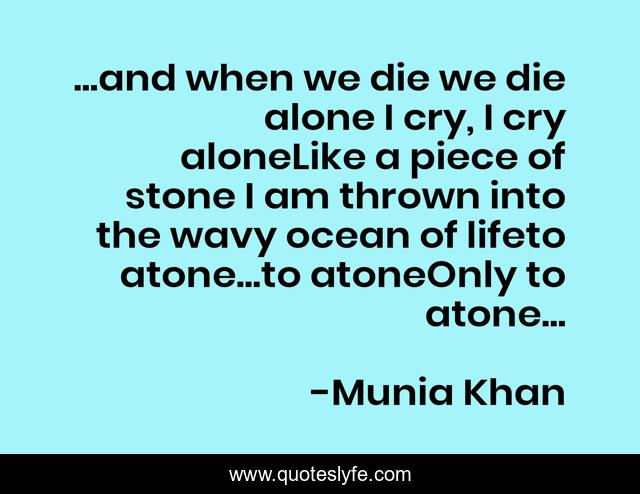 This page presents the quote "...and when we die we die alone I cry, I cry aloneLike a piece of stone I am thrown into the wavy ocean of lifeto atone...to atoneOnly to atone...". Author of this quote is Munia Khan. This quote is about melancholic, poem, life, death, crying, death-and-dying, die, cry, poetry,.