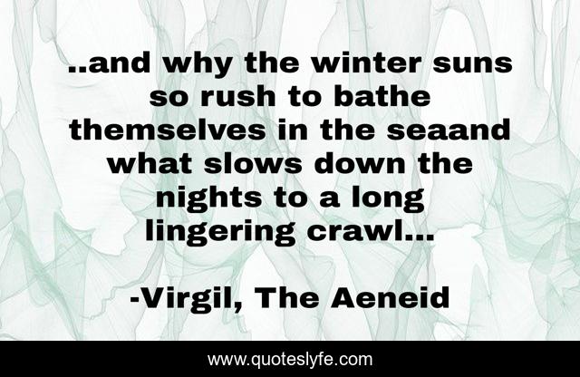 This page presents the quote "..and why the winter suns so rush to bathe themselves in the seaand what slows down the nights to a long lingering crawl...". Author of this quote is Virgil, The Aeneid. This quote is about myth, aeneid, greek, troy, virgil, trojans, mythology,.