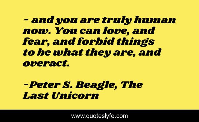 This page presents the quote "- and you are truly human now. You can love, and fear, and forbid things to be what they are, and overact.". Author of this quote is Peter S. Beagle, The Last Unicorn. .