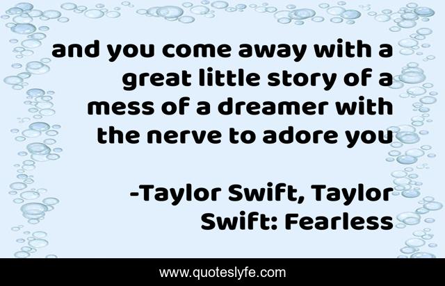 This page presents the quote "and you come away with a great little story of a mess of a dreamer with the nerve to adore you". Author of this quote is Taylor Swift, Taylor Swift: Fearless. This quote is about fearless, cold-as-you, taylor-swift,.