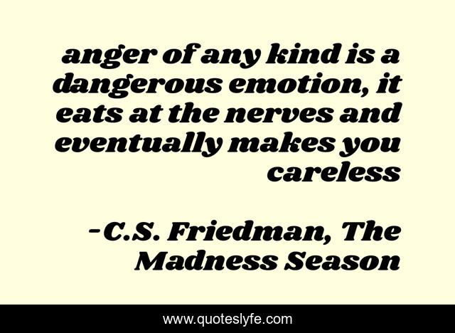 This page presents the quote "anger of any kind is a dangerous emotion, it eats at the nerves and eventually makes you careless". Author of this quote is C.S. Friedman, The Madness Season. .