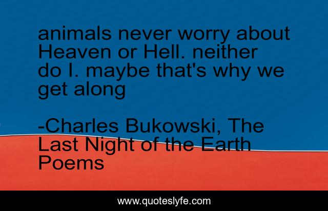This page presents the quote "animals never worry about Heaven or Hell. neither do I. maybe that's why we get along". Author of this quote is Charles Bukowski, The Last Night of the Earth Poems. This quote is about hell, heaven, animals,.