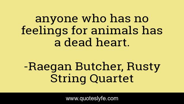 This page presents the quote "anyone who has no feelings for animals has a dead heart.". Author of this quote is Raegan Butcher, Rusty String Quartet. This quote is about animals-love, poems, poetry, prison,.