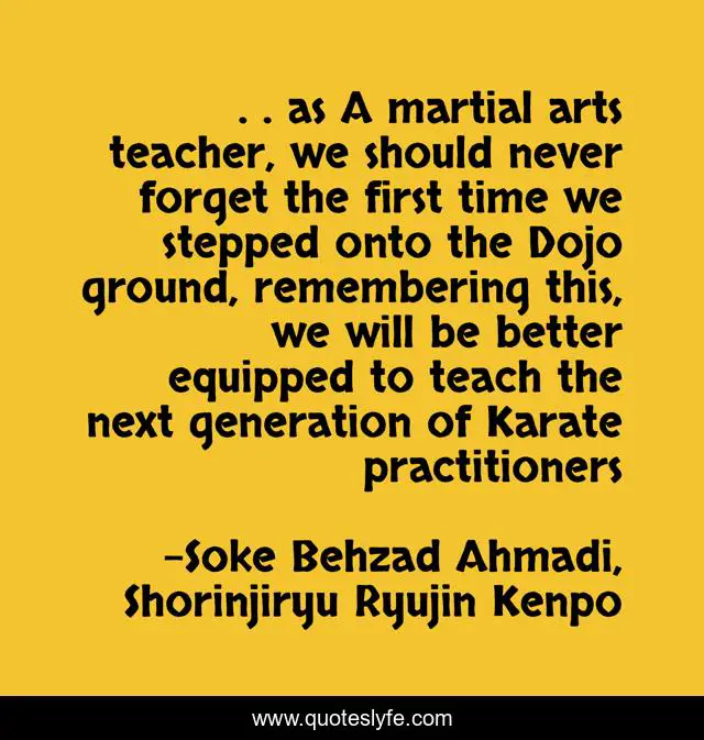 This page presents the quote ". . as A martial arts teacher, we should never forget the first time we stepped onto the Dojo ground, remembering this, we will be better equipped to teach the next generation of Karate practitioners". Author of this quote is Soke Behzad Ahmadi, Shorinjiryu Ryujin Kenpo. This quote is about dojo, generation, intelligence, shinshii, expertise, learning, ground, ryukyu, novice,.