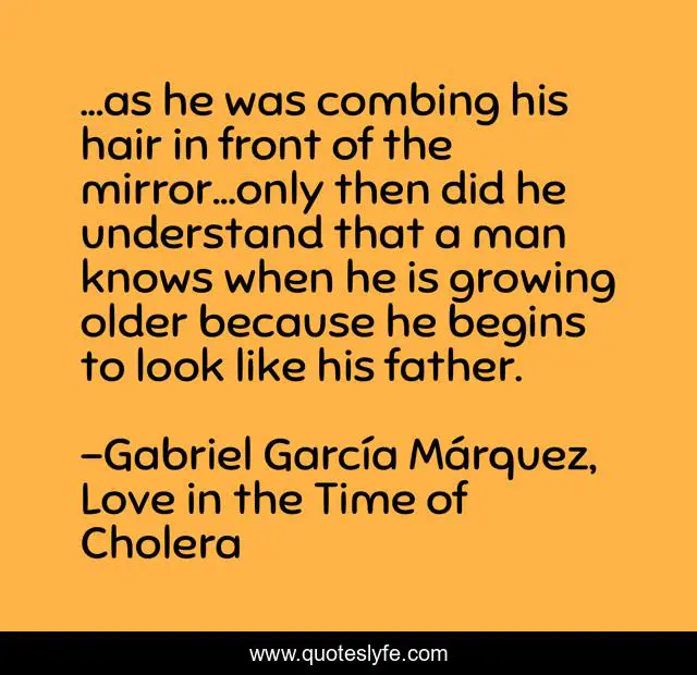This page presents the quote "...as he was combing his hair in front of the mirror...only then did he understand that a man knows when he is growing older because he begins to look like his father.". Author of this quote is Gabriel García Márquez, Love in the Time of Cholera. This quote is about aging, genetics, resemblance,.