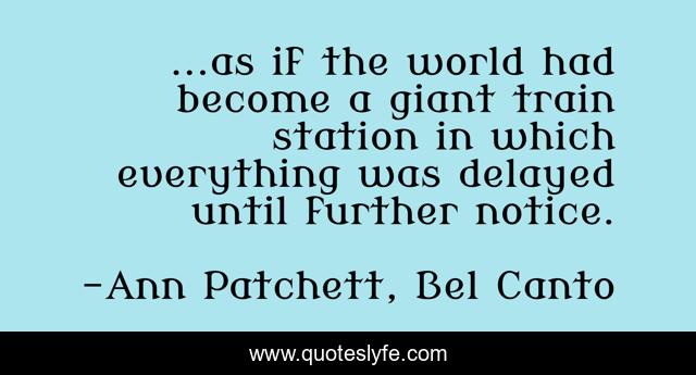 This page presents the quote "...as if the world had become a giant train station in which everything was delayed until further notice.". Author of this quote is Ann Patchett, Bel Canto. This quote is about waiting, time,.