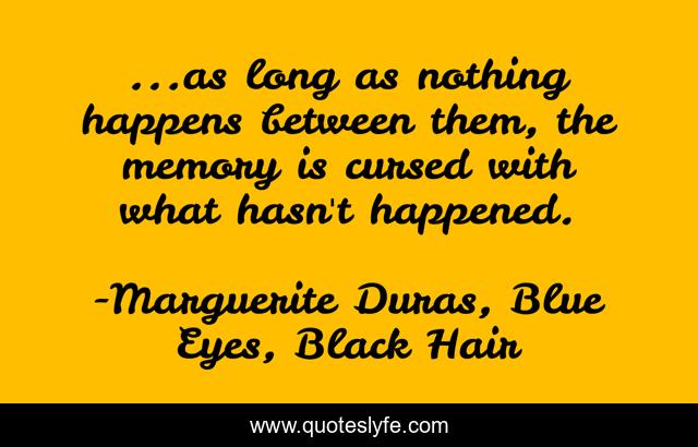 This page presents the quote "...as long as nothing happens between them, the memory is cursed with what hasn't happened.". Author of this quote is Marguerite Duras, Blue Eyes, Black Hair. This quote is about lust, waiting,.