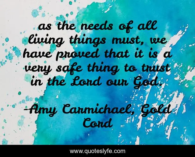 This page presents the quote "as the needs of all living things must, we have proved that it is a very safe thing to trust in the Lord our God.". Author of this quote is Amy Carmichael, Gold Cord. This quote is about need, god, safe, trust,.