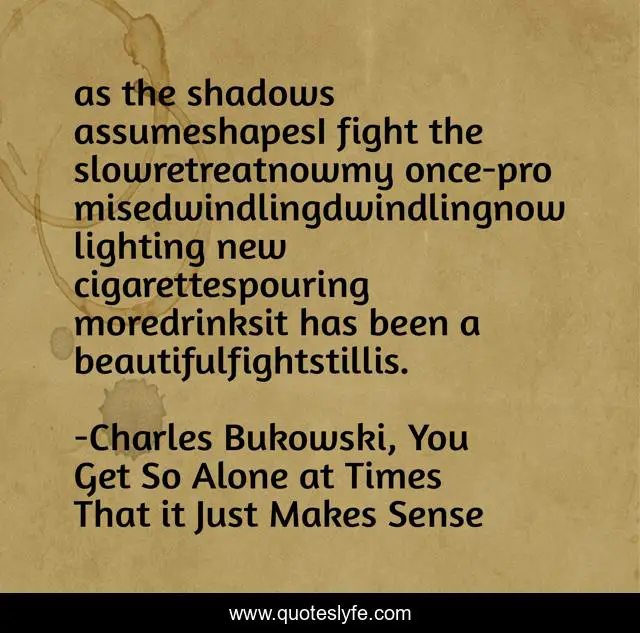 "Charles Bukowski, You Get So Alone at Times That it Just Makes Sense Quotes." Quoteslyfe.com, 2025. Mon. 08 Dec. 2025. <https://www.quoteslyfe.com/quote/as-the-shadows-assumeshapesI-fight-the-slowretreatnowmy-165534>.