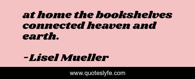 This page presents the quote "at home the bookshelves connected heaven and earth.". Author of this quote is Lisel Mueller. This quote is about heaven, poetry, literature, books, curiosity, earth, reading, wonder,.