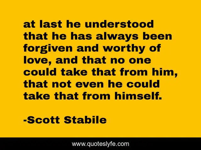 This page presents the quote "at last he understood that he has always been forgiven and worthy of love, and that no one could take that from him, that not even he could take that from himself.". Author of this quote is Scott Stabile. This quote is about love, acceptance, understanding, worthy-of-love, worthy, affection,.