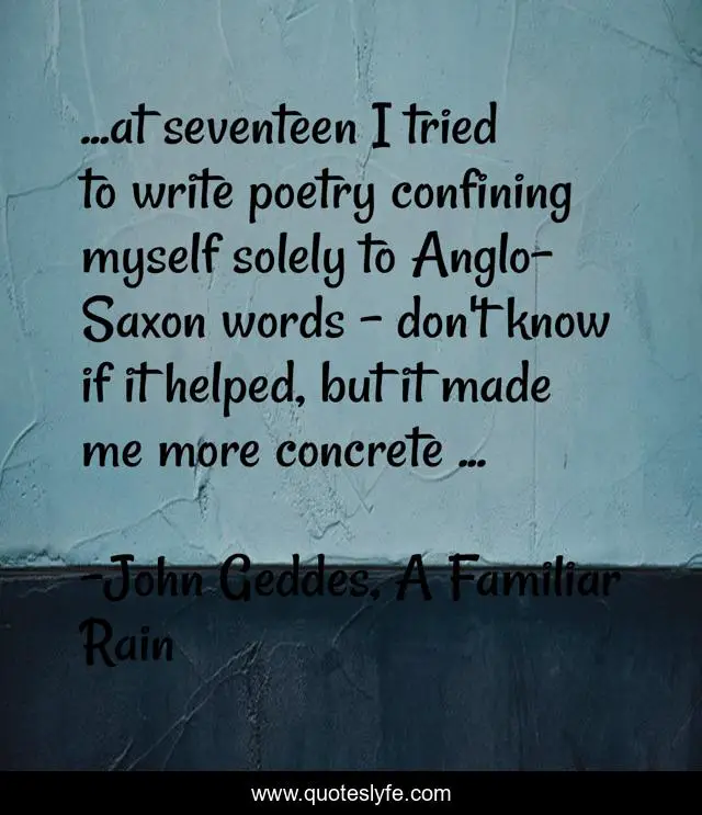 This page presents the quote "...at seventeen I tried to write poetry confining myself solely to Anglo-Saxon words - don't know if it helped, but it made me more concrete ...". Author of this quote is John Geddes, A Familiar Rain. This quote is about writing-craft, writing-process-writing-advice, writing,.