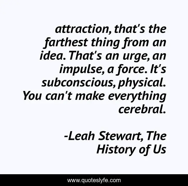 This page presents the quote "attraction, that's the farthest thing from an idea. That's an urge, an impulse, a force. It's subconscious, physical. You can't make everything cerebral.". Author of this quote is Leah Stewart, The History of Us. This quote is about cerebral, attraction, subconscious,.
