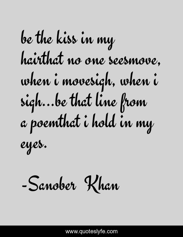 This page presents the quote "be the kiss in my hairthat no one seesmove, when i movesigh, when i sigh...be that line from a poemthat i hold in my eyes.". Author of this quote is Sanober Khan. This quote is about poem, falling-in-love, love, kiss, sigh, magical, poetry, horizon, holding,.