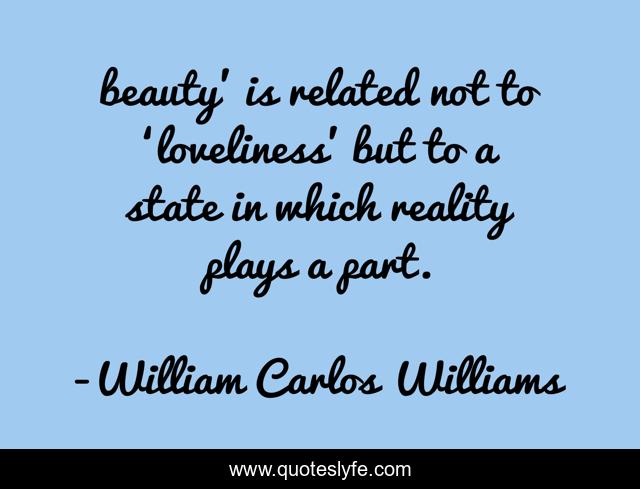 This page presents the quote "beauty’ is related not to ‘loveliness’ but to a state in which reality plays a part.". Author of this quote is William Carlos Williams. This quote is about poetry, beauty, reality,.