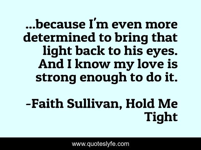 This page presents the quote "...because I'm even more determined to bring that light back to his eyes. And I know my love is strong enough to do it.". Author of this quote is Faith Sullivan, Hold Me Tight. This quote is about new-adult, contemporary-romance, new-release,.