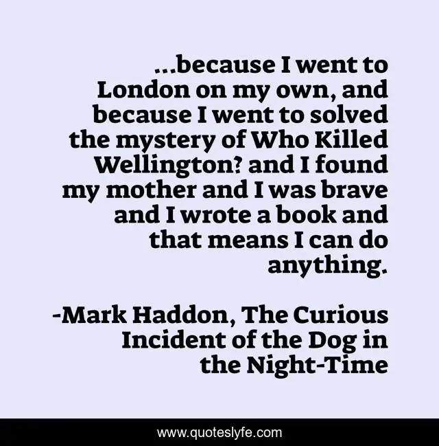 This page presents the quote "...because I went to London on my own, and because I went to solved the mystery of Who Killed Wellington? and I found my mother and I was brave and I wrote a book and that means I can do anything.". Author of this quote is Mark Haddon, The Curious Incident of the Dog in the Night-Time. This quote is about imaginative, confidence, bravery, inspirational, enthusiasm,.