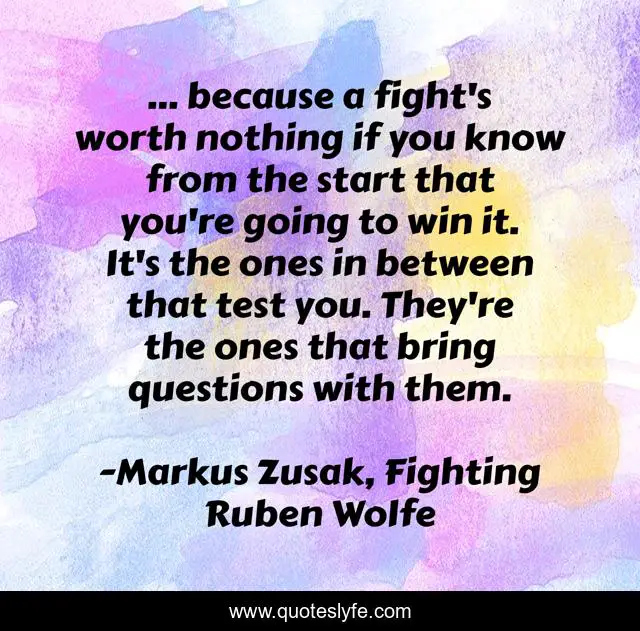 This page presents the quote "... because a fight's worth nothing if you know from the start that you're going to win it. It's the ones in between that test you. They're the ones that bring questions with them.". Author of this quote is Markus Zusak, Fighting Ruben Wolfe. This quote is about test, win, worth-nothing, questions, fight,.