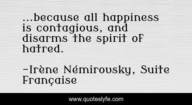 This page presents the quote "...because all happiness is contagious, and disarms the spirit of hatred.". Author of this quote is Irène Némirovsky, Suite Française. .