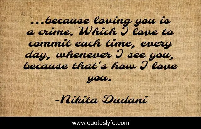 This page presents the quote "...because loving you is a crime. Which I love to commit each time, every day, whenever I see you, because that's how I love you.". Author of this quote is Nikita Dudani. This quote is about love, lover, crime, love-story, love-hurts, affection,.