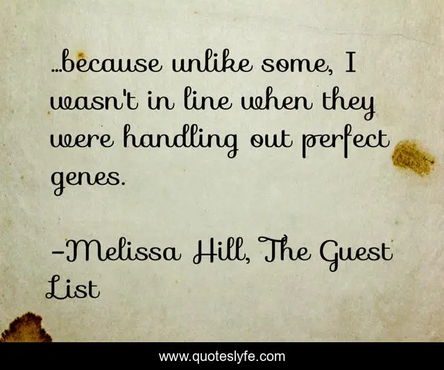 This page presents the quote "...because unlike some, I wasn't in line when they were handling out perfect genes.". Author of this quote is Melissa Hill, The Guest List. This quote is about love, family, groom, bride, wedding, affection,.
