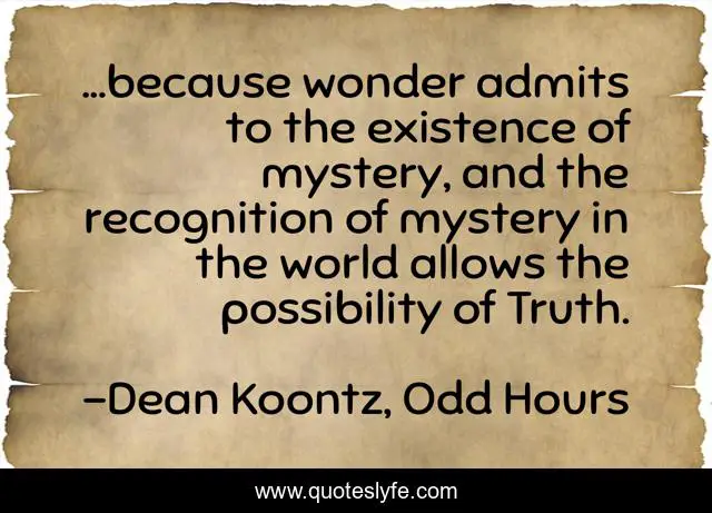 This page presents the quote "...because wonder admits to the existence of mystery, and the recognition of mystery in the world allows the possibility of Truth.". Author of this quote is Dean Koontz, Odd Hours. This quote is about mystery, possibilities, odd-thomas, truth, wonder,.